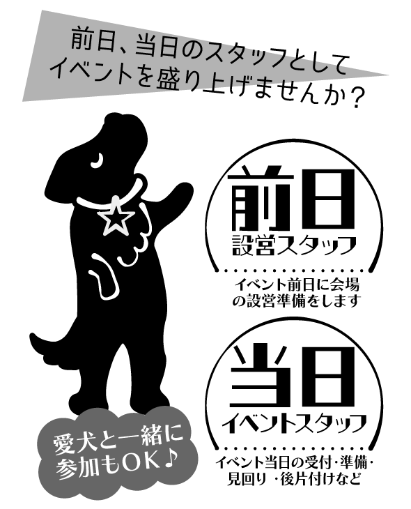 イベントの前日、ネット張りや看板設置など、力を合わせて会場を作ります。午前のみ・午後のみでもOK!都合に合わせてご協力ください。一緒に来た愛犬は、前日に会場をおもいっきり走り回れるおまけ付き♪ 半日以上お手伝いいただいた方(中学生以上)には当日の入場チケットをプレゼント!